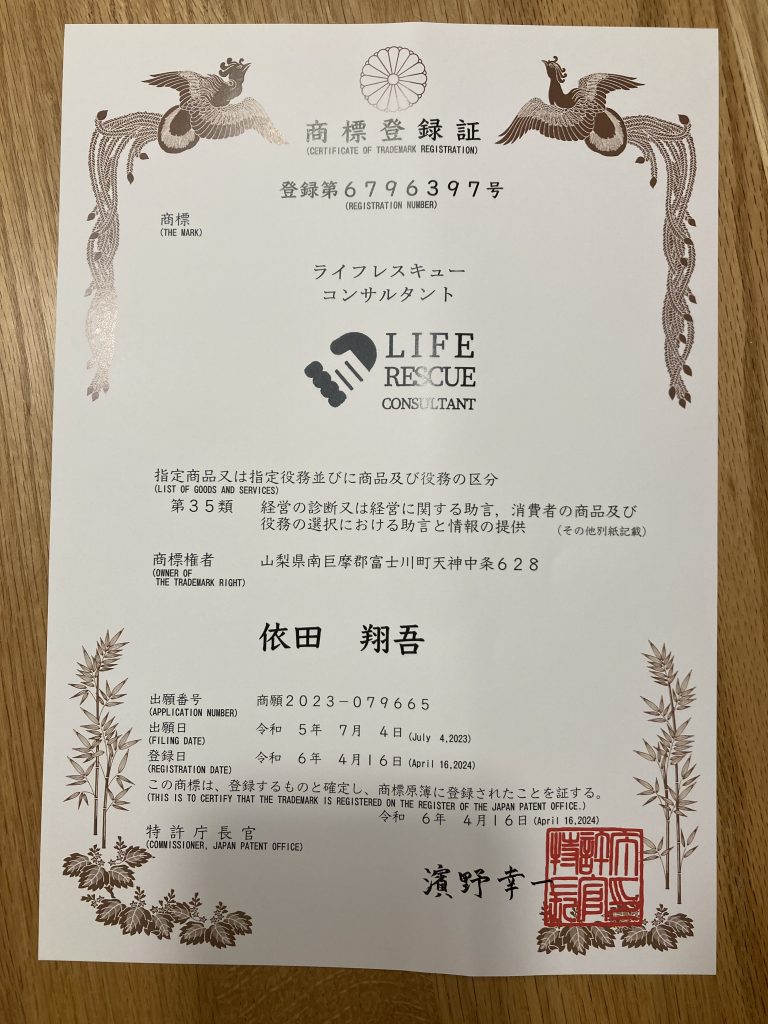 人生の教習所の教官としての役割「ライフレスキューコンサルタント」として商標登録をいたしました。
